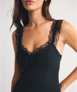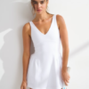 Our new collection built to make going bra-free that much smoother. This flattering mini dress is in our soft crepe fabric. Features a V-neckline with lace-trim and button-through details and a seamed-in bra with removable pads to go bra-free. Imported.