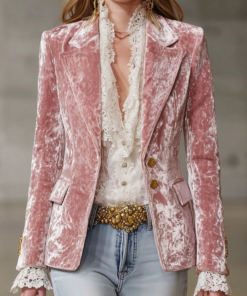– Design: Gold button accents with lapel collar