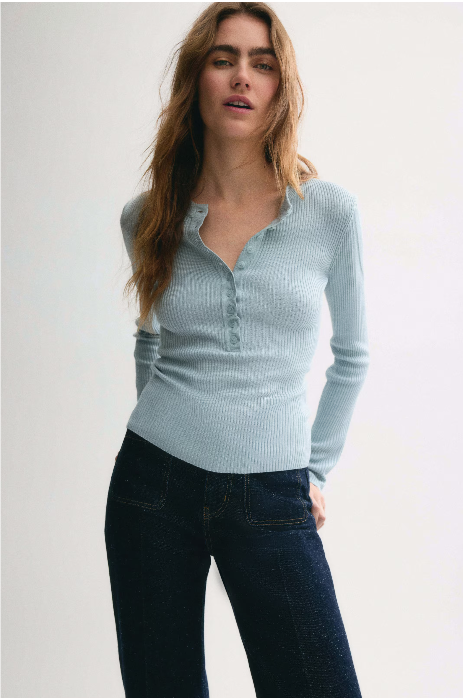 Fitted, rib-knit top. Round neckline, button placket, and long sleeves.
