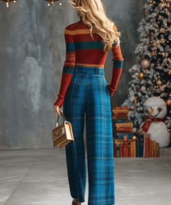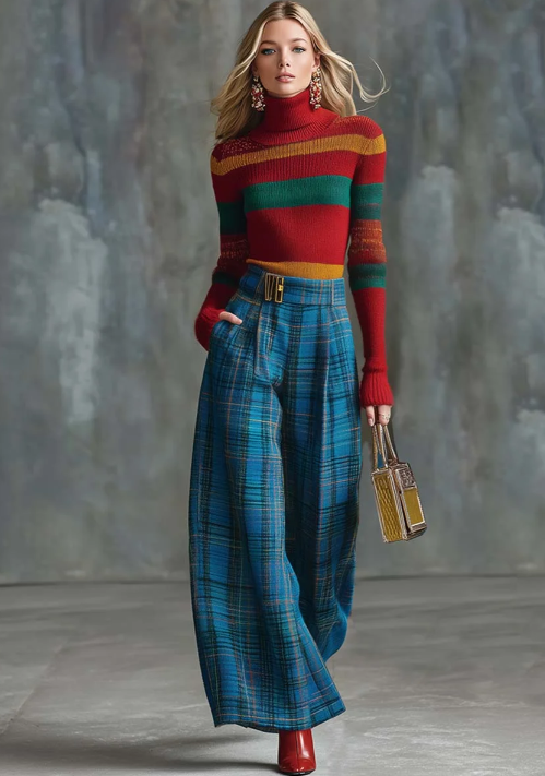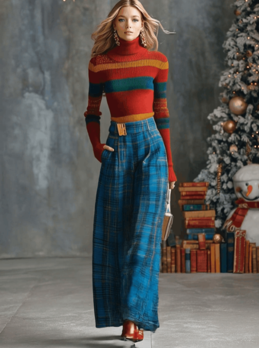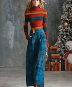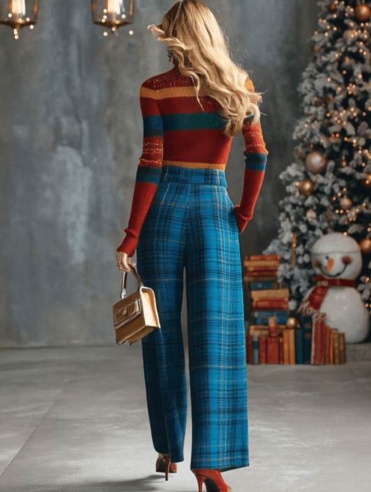 Vintage Fashion Versatile Blue Plaid Wide-leg Pants