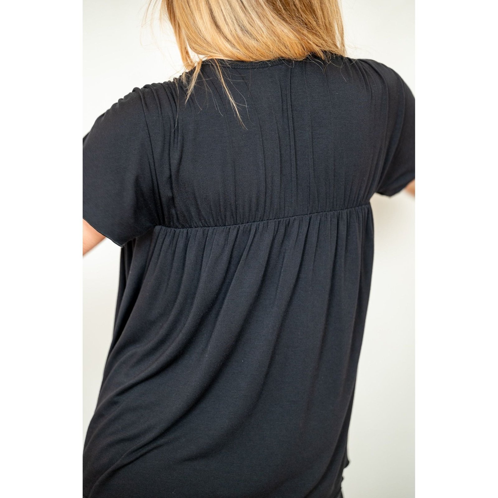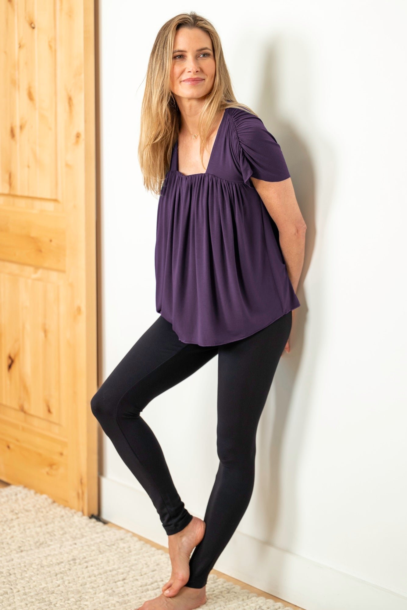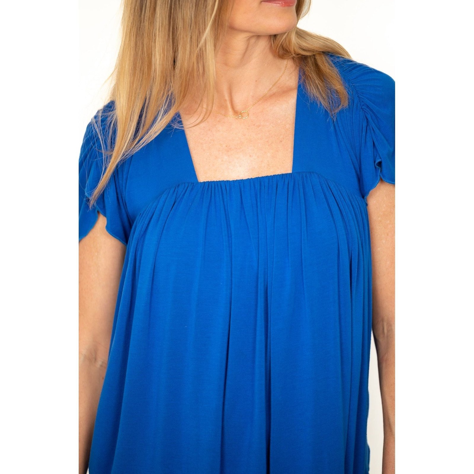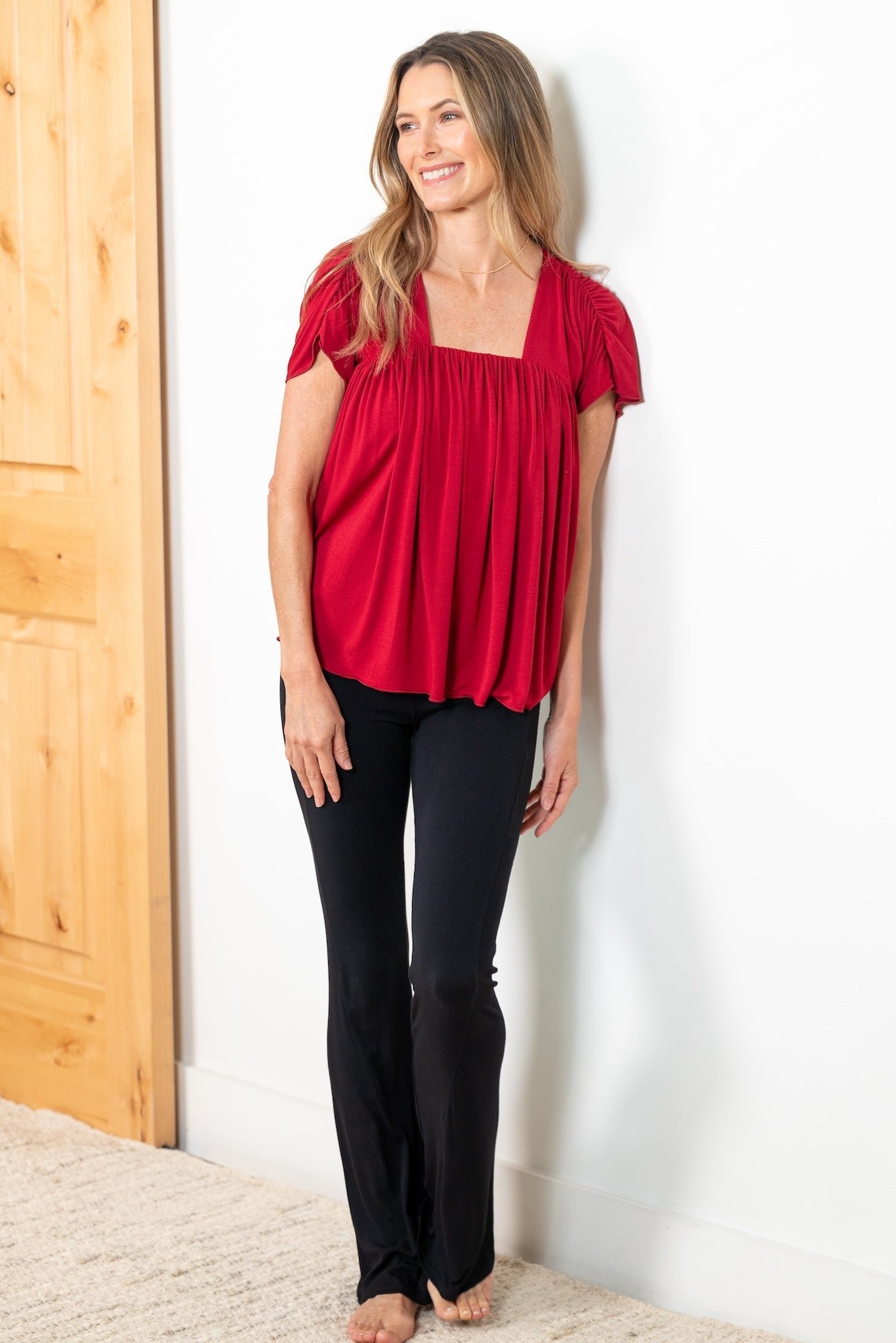 This stylish women’s top features a square neckline and soft pleated detailing for a relaxed, flattering fit. The short sleeves add a touch of ease, making it perfect for everyday wear, casual outings, or layering. Available in Black, Cobalt, Deep Teal, Evergreen Rib, Crimson, and Amethyst Rib, this versatile piece pairs effortlessly with shorts, jeans, or lounge bottoms. Designed for comfort and style, it’s an easy wardrobe essential for any season.