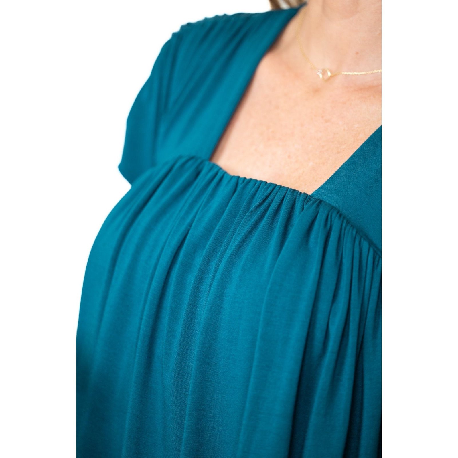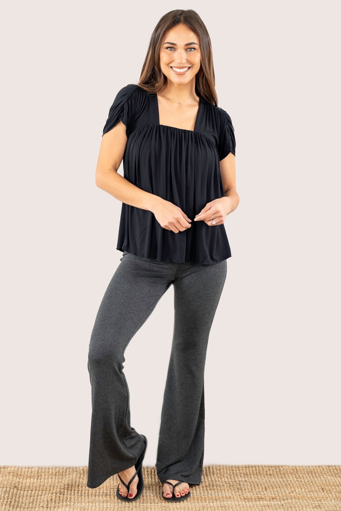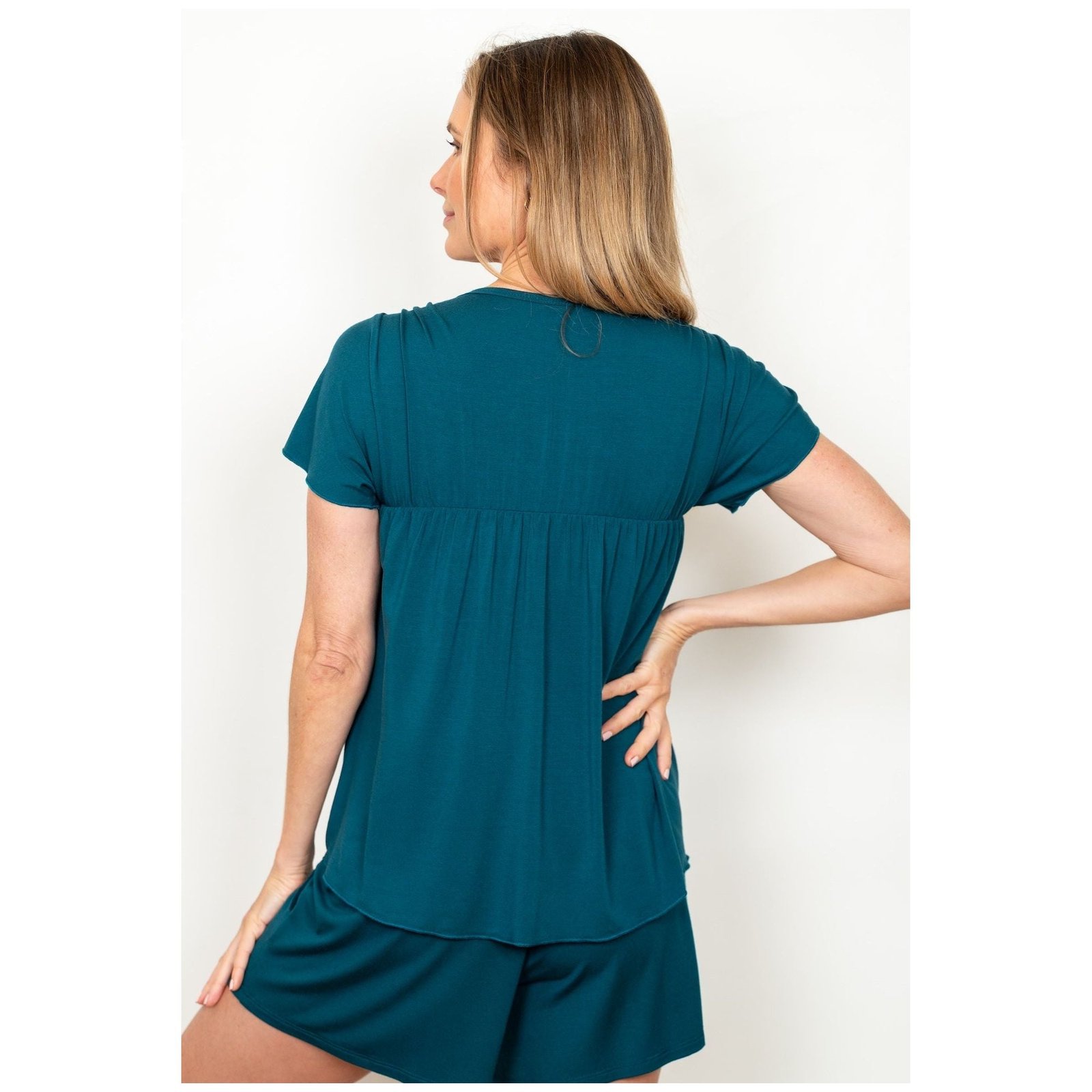 This stylish women’s top features a square neckline and soft pleated detailing for a relaxed, flattering fit. The short sleeves add a touch of ease, making it perfect for everyday wear, casual outings, or layering. Available in Black, Cobalt, Deep Teal, Evergreen Rib, Crimson, and Amethyst Rib, this versatile piece pairs effortlessly with shorts, jeans, or lounge bottoms. Designed for comfort and style, it’s an easy wardrobe essential for any season.